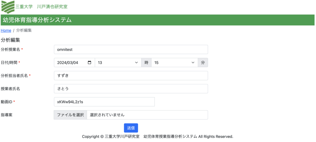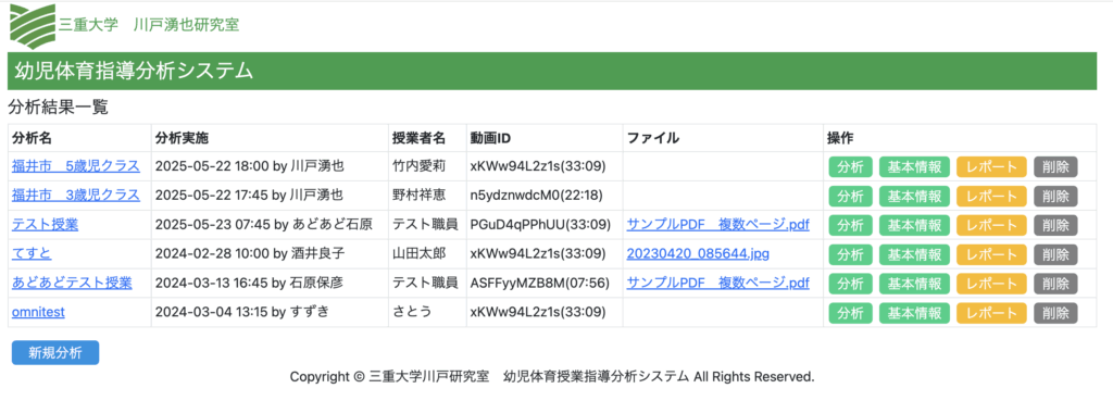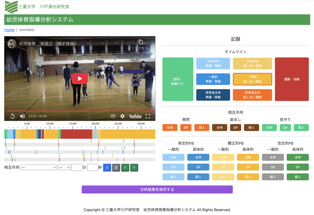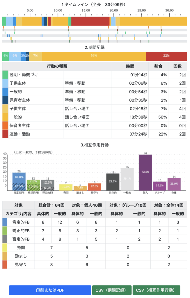 その動画をインポートして、指導内容のタイムライン、指導者行動分類、声がけや励ましなどの相互作用をプロット